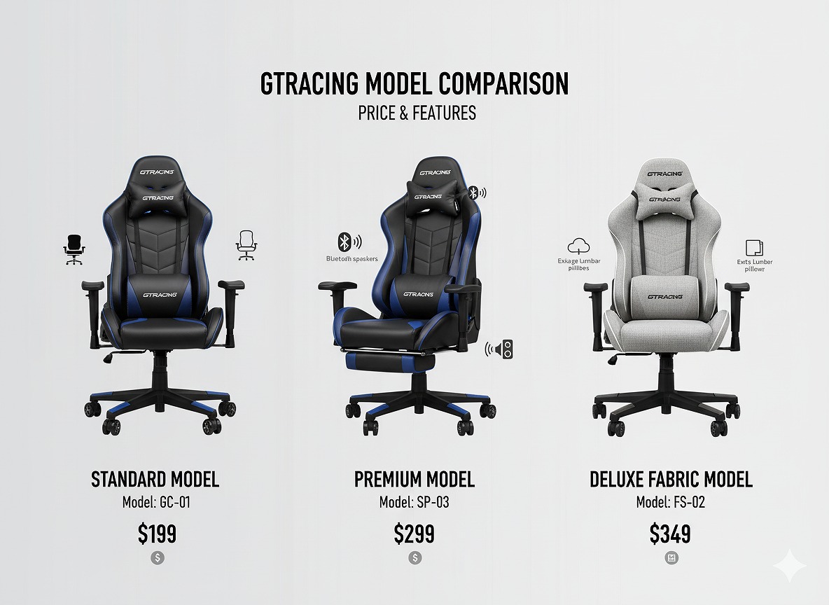 GTRacingの製品は、機能や素材によっていくつかの価格帯に分かれています。代表的なモデルの実勢価格(セール等により変動あり)を比較してみましょう。