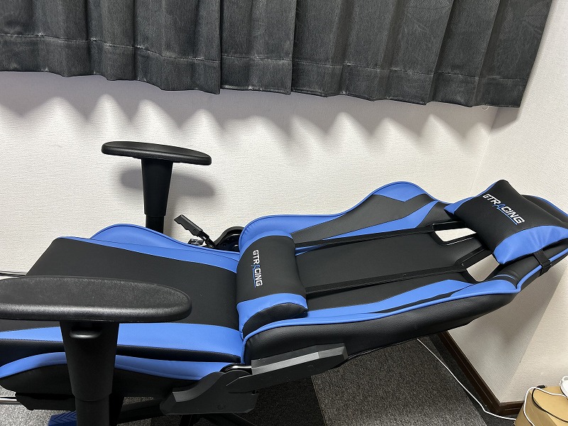 GTRacingの製品は、SGSという国際的な検査機関の認証を得た部品を使用しており、耐荷重も136kgと頑丈な作りになっています。リクライニングを最大まで倒しても安定しており、安全性に関する不安は感じませんでしたね。