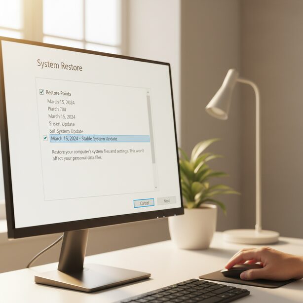 「Windows Updateの後から調子が悪い」「新しいソフトをインストールしてからカーソルが消えた」など、特定の操作をきっかけに問題が発生した場合は、「システムの復元」が有効です。これは、パソコンのシステムファイルや設定を、問題が発生する前の正常な状態(復元ポイント)に戻す機能です。