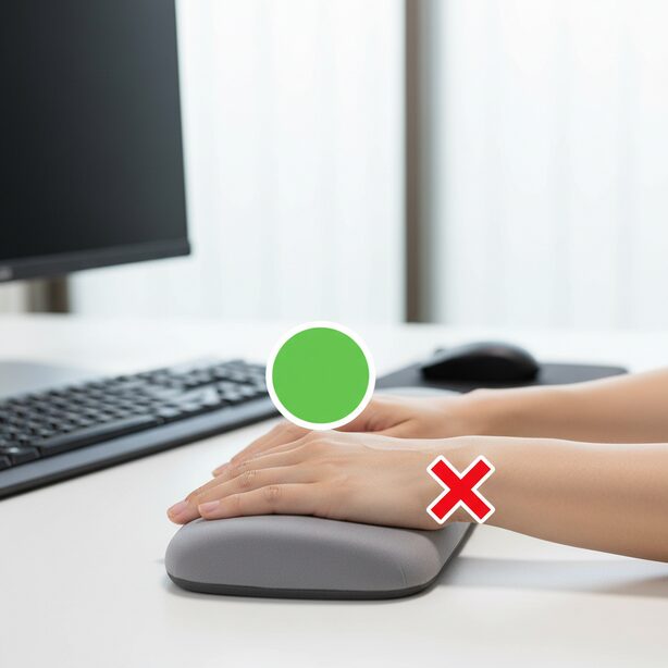 手首の関節部分(脈がとれる柔らかい部分)を直接リストレストに乗せて圧迫し続けると、そこにある血管や神経(手根管)を圧迫してしまいます。これが血行不良やしびれの原因になるため、絶対に避けましょう。あくまで手のひらを休ませる「パームレスト」のイメージで使うのが正解です。