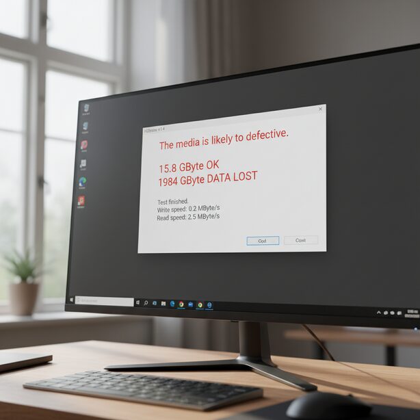 まず、偽物であることを証明するための客観的な証拠を集めます。- H2testwのテスト結果(エラー画面)のスクリーンショット